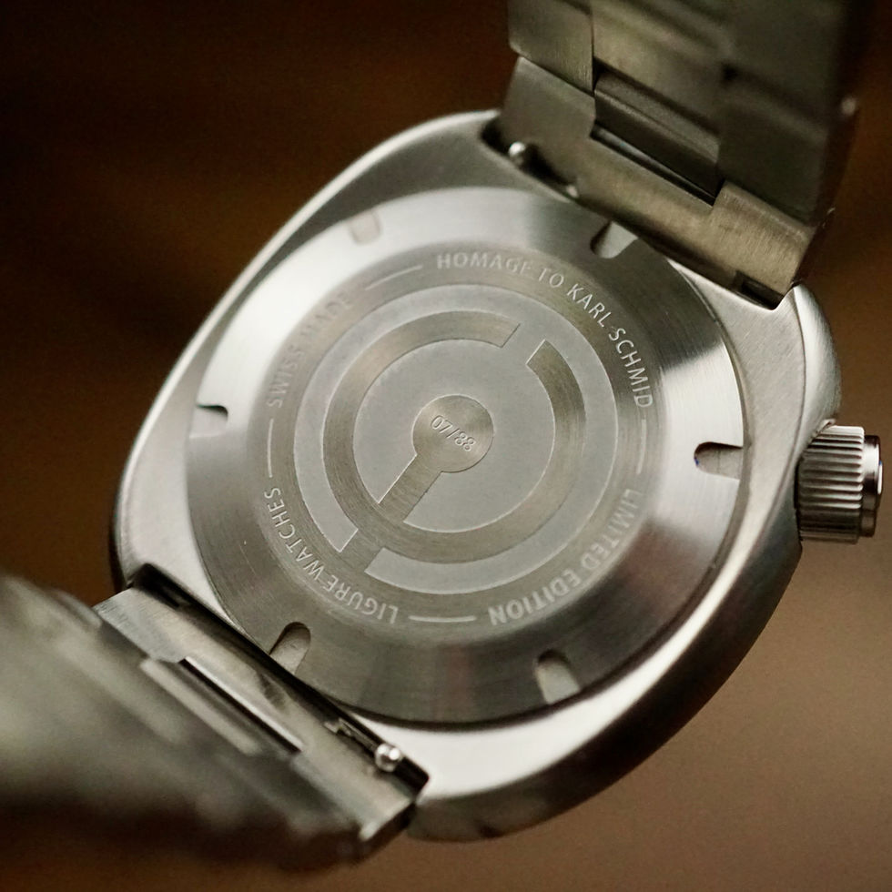 The collaboration between Oliver Ike, former founder of the Ikepod watch brand and current president of the Karl Schmid Art Foundation, and LIGURE WATCHES has resulted in this limited edition timepiece in homage to Karl Schmid. "Combining modern art with watchmaking is a way of making a watch timeless and absolutely unique," Oliver Ike concludes. This LIGURE timepiece comes with a stainless-steel bracelet and a rubber strap both of which are easily interchangeable by the customer with the press of a notch near the case. The watch case with a screwed-in crown has a diameter of 41 mm and is water-resistant to 200 meter.